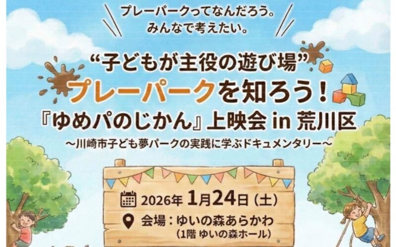 2026年1月24日(土)、ゆいの森あらかわにて「ゆめパのじかん」の無料上映会が開催されます。 「ゆめパのじかん」は川崎市子ども夢パークの実践についてのドキュメント映画です。夢パークは子どもが主役も遊び場であるプレーパー