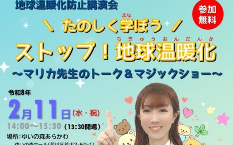 2026年2月11日(水・祝)、ゆいの森あらかわにて地球温暖化防止講演会「たのしく学ぼう ストップ!地球温暖化 ~マリカ先生のトーク&マジックショー~」が開催されます。 講師は環境教育インストラクターであり、防災士でもあ
