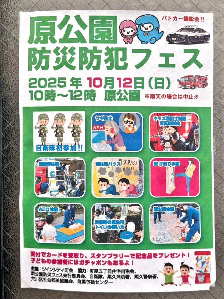 2025年10月12日(日)、原公園にて「原公園 防災防犯フェス」が開催されます。