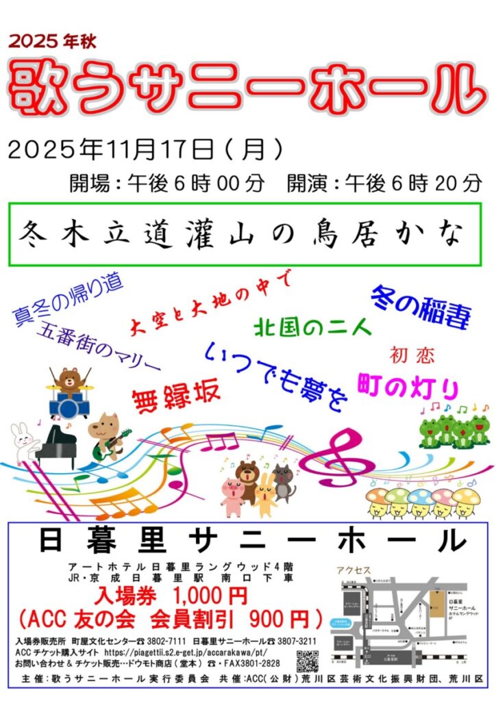 2025年11月17日(月)、日暮里サニーホールにて「歌うサニーホール 2025 秋」が開催されます。