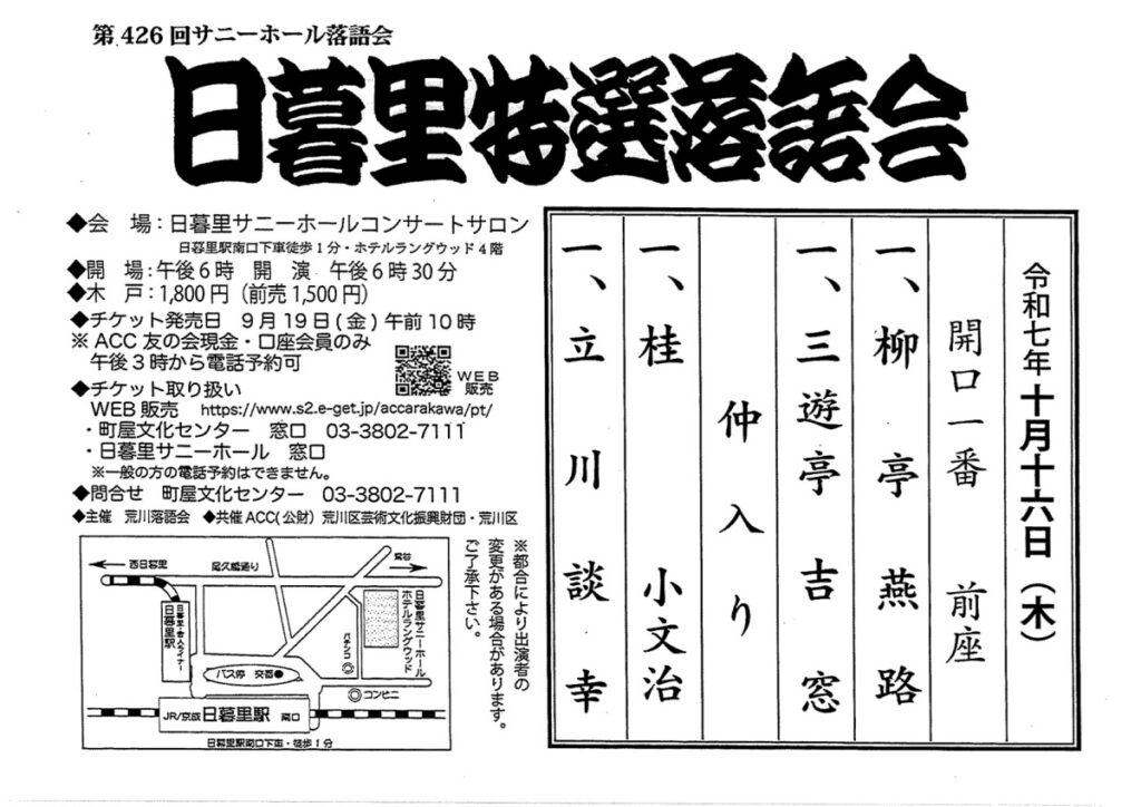 2025年10月16日(木)、日暮里サニーホールにて「第426回 サニーホール落語会 ~日暮里特選落語会~」が開催されます。