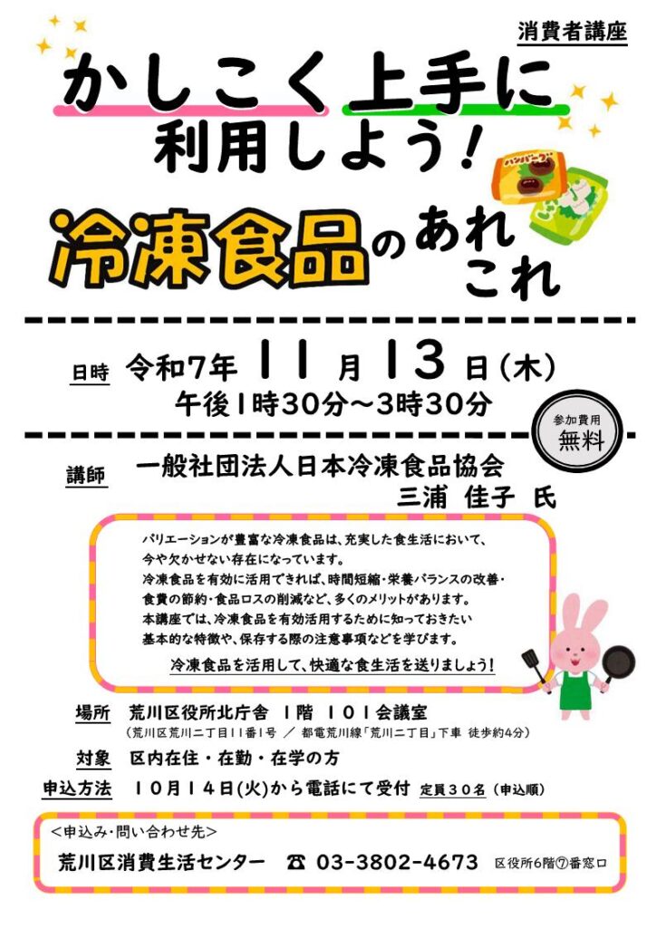 2025年11月13日(木)、荒川区役所北庁舎にて消費者講座の「かしこく上手に利用しよう!冷凍食品のあれこれ」が開催されます。