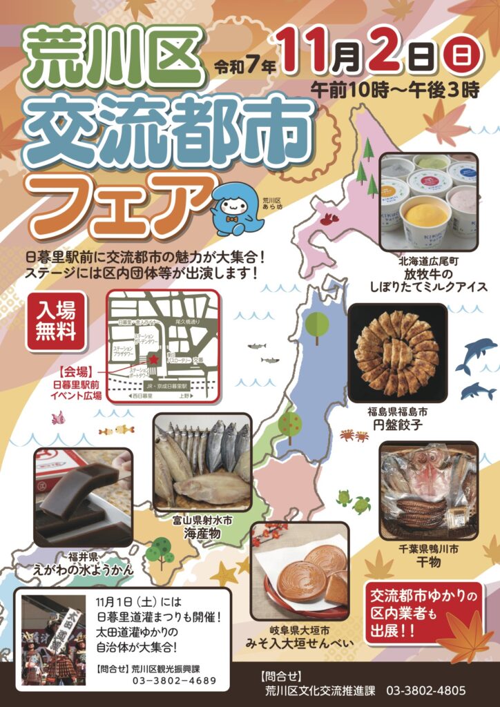 2025年11月2日(日)、日暮里駅前イベント広場にて「荒川区交流都市フェア開催」が開催されます。
