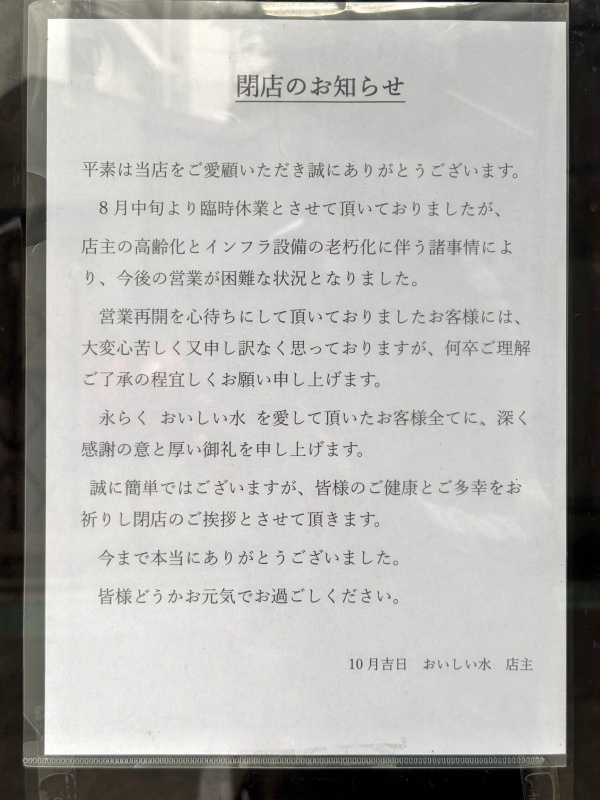 閉店のお知らせです。店主の高齢化とインフラ設備の老朽化に伴う諸事情が理由とのことです。