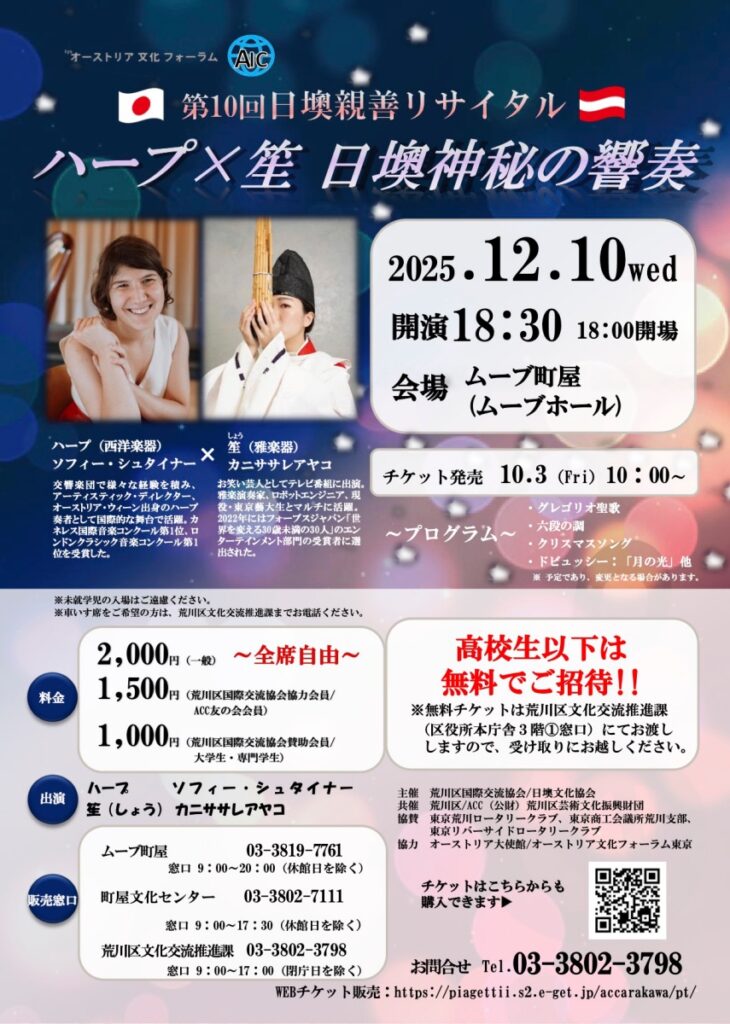 2025年12月10日(水)、ムーブ町屋にて「第10回日墺親善リサイタル ハープ(西洋楽器)×笙(雅楽器)日墺神秘の響奏」が開催されます。