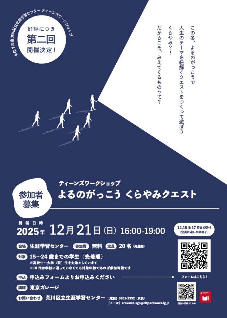 2025年12月21日(日)、荒川区立生涯学習センターにて「よるのがっこう くらやみクエスト」が開催されます。
