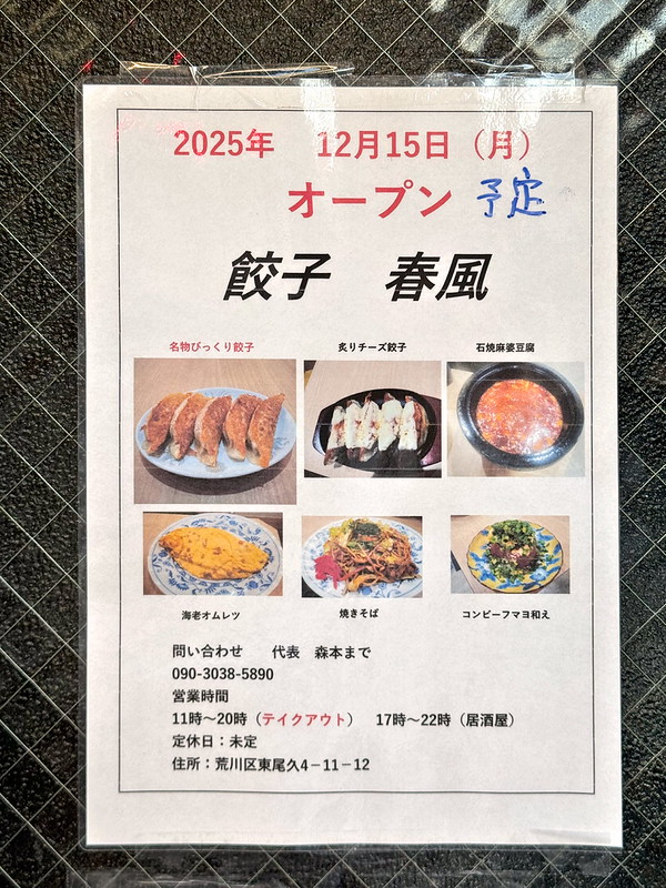 ここに「餃子 春風」とあります。おそらくこれが店名でしょう。そして2025年12月15日(月)オープン予定ともあります。