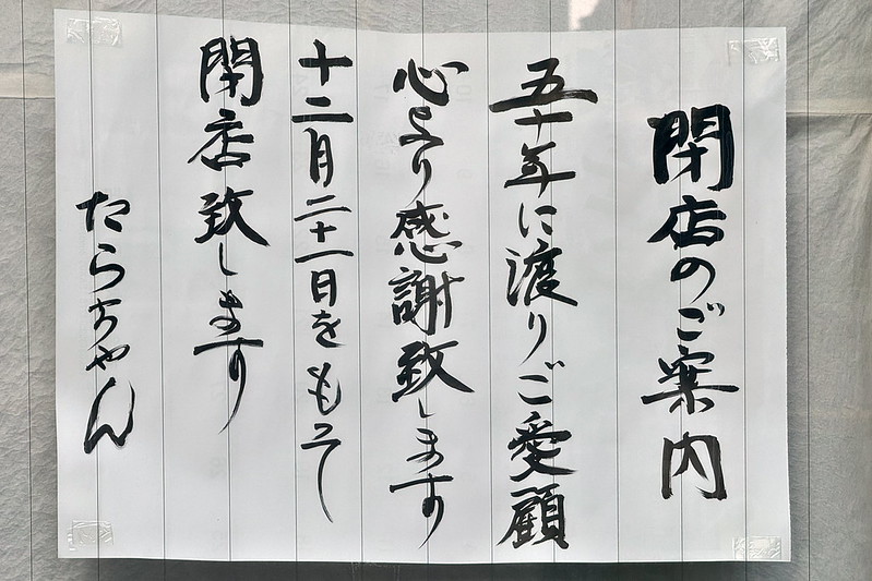 2025年12月21日(日)をもって閉店とのことです。なお、50年に渡るお店の歴史があったそうです。