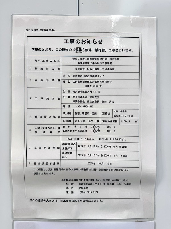 なお、尾竹橋通り沿いのフェンスのところには解体工事のお知らせも掲示されています。