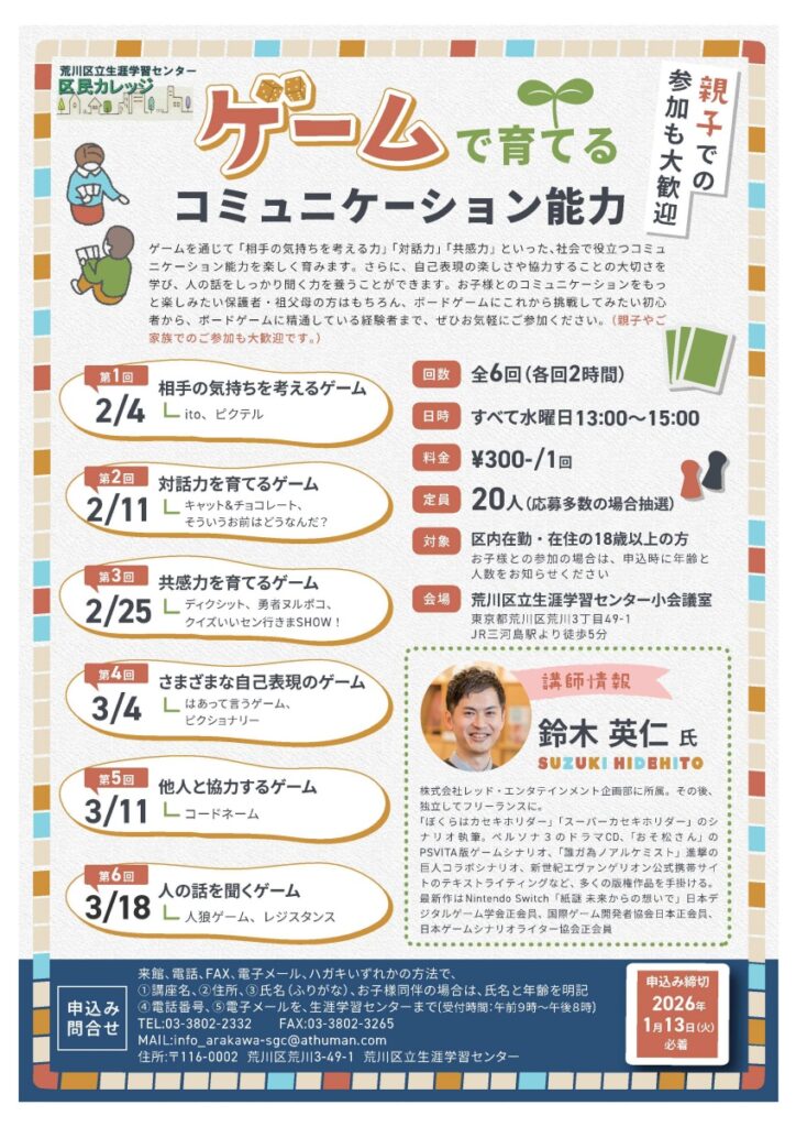 2026年2月から3月にかけて荒川区立生涯学習センターにて全6回の講座「ゲームで育てるコミュニケーション能力」が開催されます。