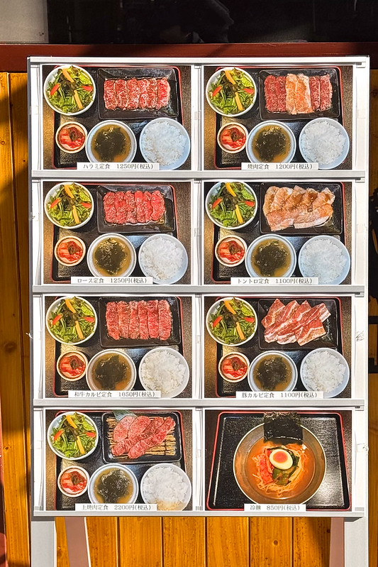 ランチのものです。1100円の豚カルビ定食、豚トロ定食、1200円の焼肉定食などがあります。定食にはお肉、ご飯、スープん、キムチ、サラダがついてくるようです。個人的にハラミかロースを食べてみたいです。