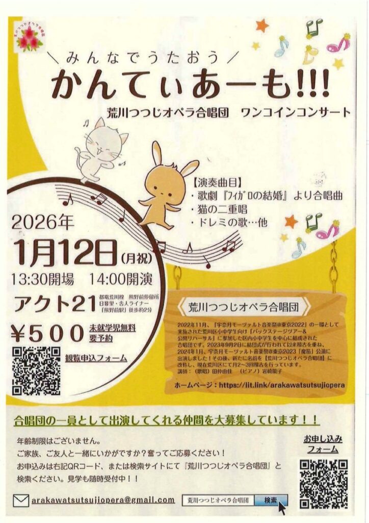 2026年1月12日(月・祝)、アクト21にて荒川つつじオペラ合唱団のワンコインコンサート「かんてぃあーも!!!」が開催されます。