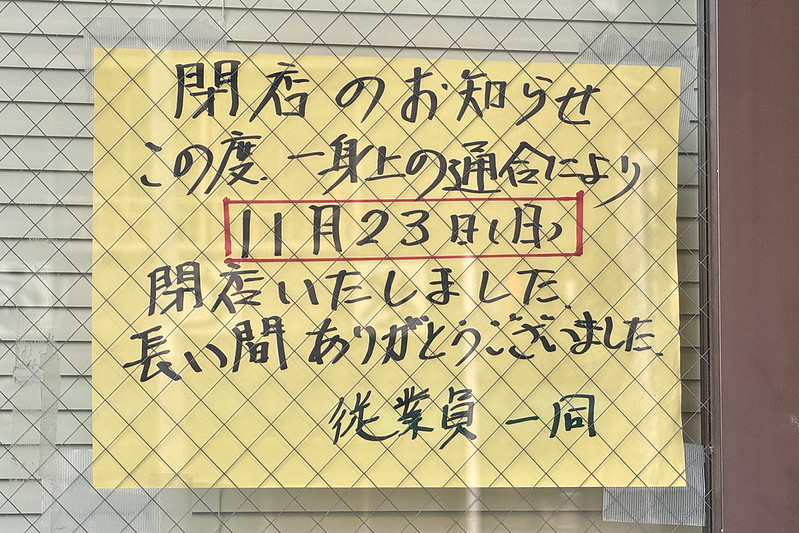 閉店のお知らせです。2025年11月23日(日)で閉店したとのことです。