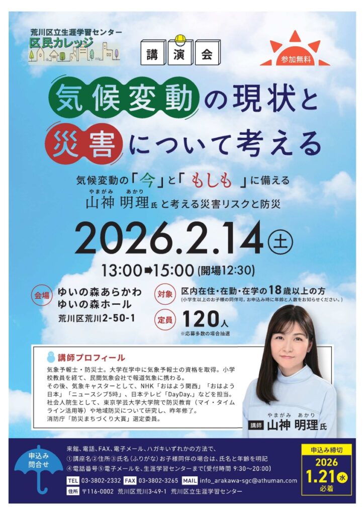 2026年2月14日(土)、ゆいの森あらかわにて講演会「気候変動の現状と災害について考える」が開催されます。