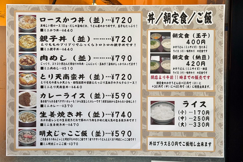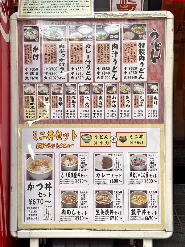 かけうどんの小は350円です。うどんとミニ丼のセットもありますね。