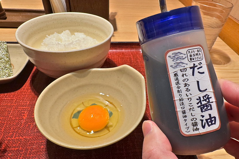 朝定食(玉子)にはうどん以外にはライス、生玉子、海苔もついてきます。各席に置いてあるだし醤油で玉子かけご飯にして食べました。