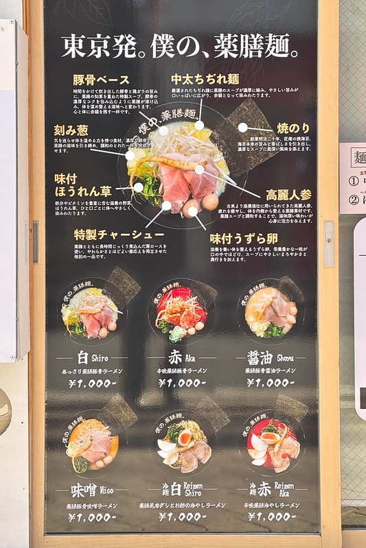豚骨、味噌、醤油などがあります。基本が1000円で、そこにお好みのトッピングを付け加えることができました。入口入ったすぐのところに食券機があり、そこで食券を購入します。今回筆者はメニュー表に「白」とあった、あっさり薬膳豚骨ラーメンにしました。