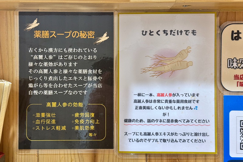 具はほうれん草、チャーシュー、うずらの卵、ネギ、もやし、焼きのり、そして高麗人参です。