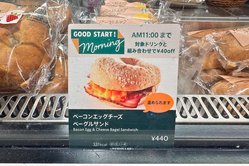 スタバでフードを食べたことはあまりないのですが、この日は朝7時のオープン直後ということもあってか種類が豊富でした。この中にあるベーコンエッグチーズベーグルサンドを買うことにしました。440円。