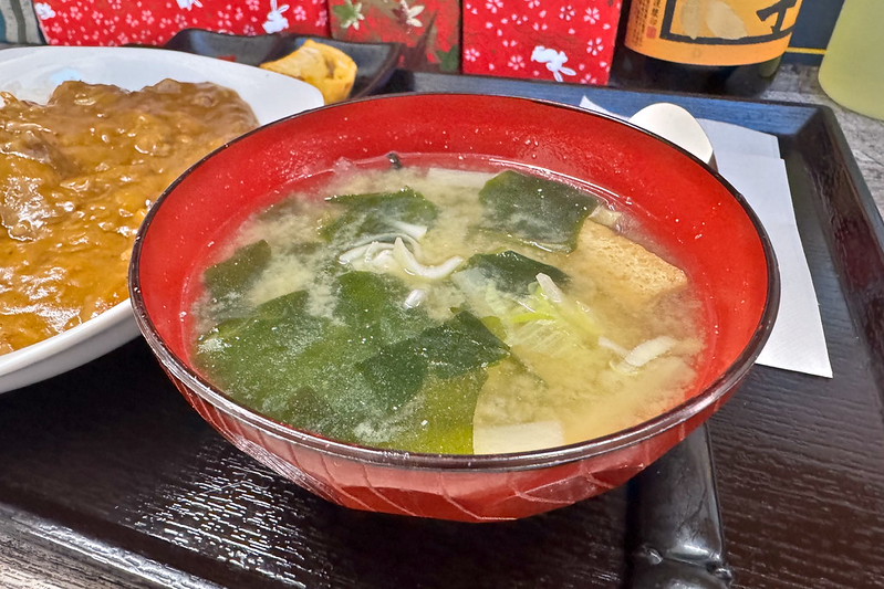 お味噌汁、卵焼き、福神漬、メインの牛すじカレーのセットです。後からデザートも出てきます。