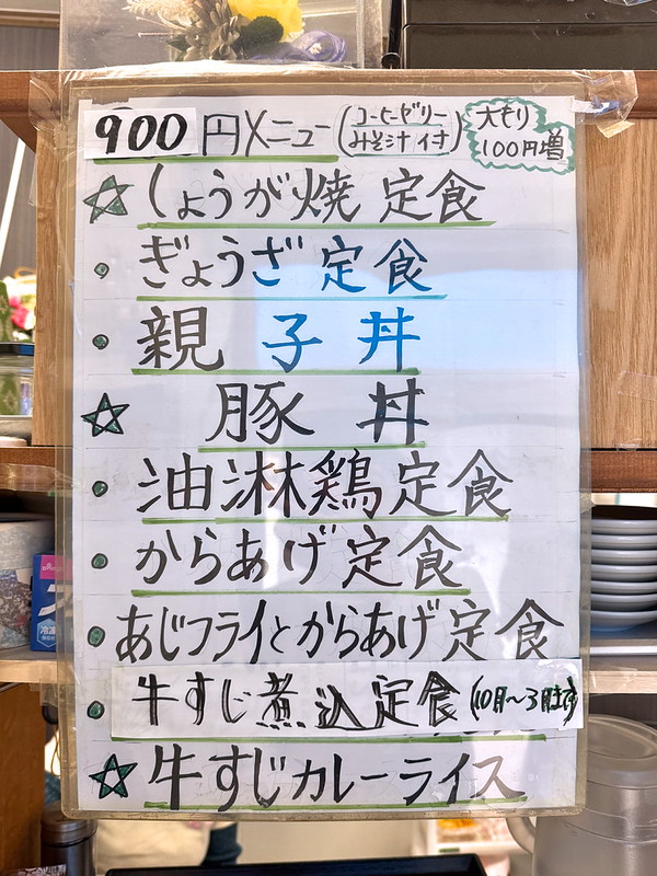 生姜焼きやからあげなどの食堂の定番があります。また、10月から3月までの期間限定で牛すじ煮込定食もありますね。今回筆者は最初から牛すじカレーライスを食べると決めていました。850円です。星印が850円で、その他が900円なのかな。