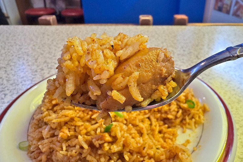 意外なことに、お米がふんわりしていました。チャーハンのしっとり系ともパラパラ系とも違います。ふんわりなのです。初めて食べる感触でした。鶏肉はゴロゴロと一口大サイズのものが入っています。こちらも柔らか。全体的な味付けは結構辛めです。じんわりと汗をかいてきたくらいです。食べている最中にお店の方が「辛さは大丈夫?」と聞いてきたので、日本人にとってはちょっと辛めなのかもしれません。しかし、美味しさがしっかりとあるので休む間もなく完食しちゃいました。お腹いっぱいです。