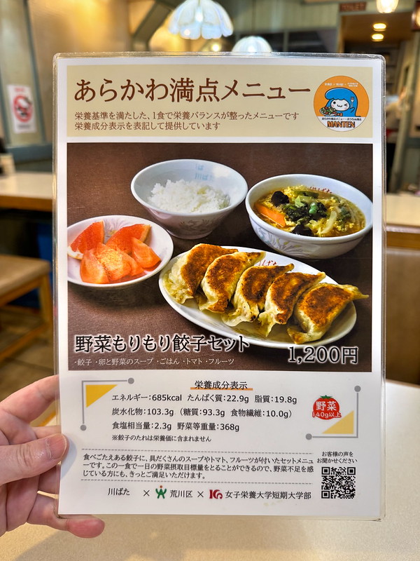 女子栄養大学短期大学部と荒川区、そして川ばたの3者によって開発されたあらかわ満点メニューである野菜もりもり餃子セットです。栄養バランスをしっかり考えられたメニューということで、こちらを注文してみました。1200円です。