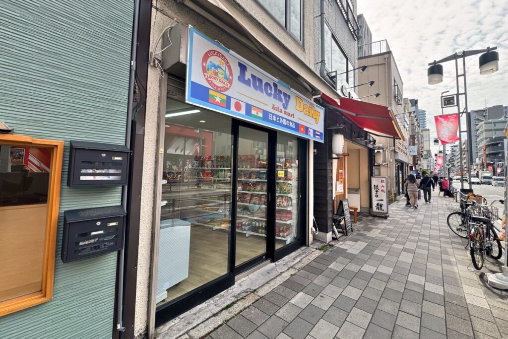 店名は「Lucky Daily」ですね。「日本と外国の食品」とも書かれています。その両サイドにはミャンマー、日本、インド、ベトナム、ネパール、タイの国旗も描かれています。