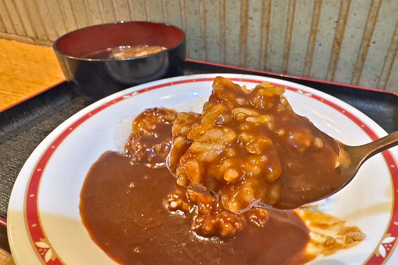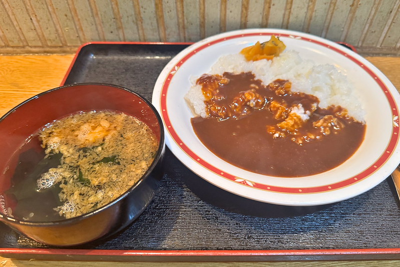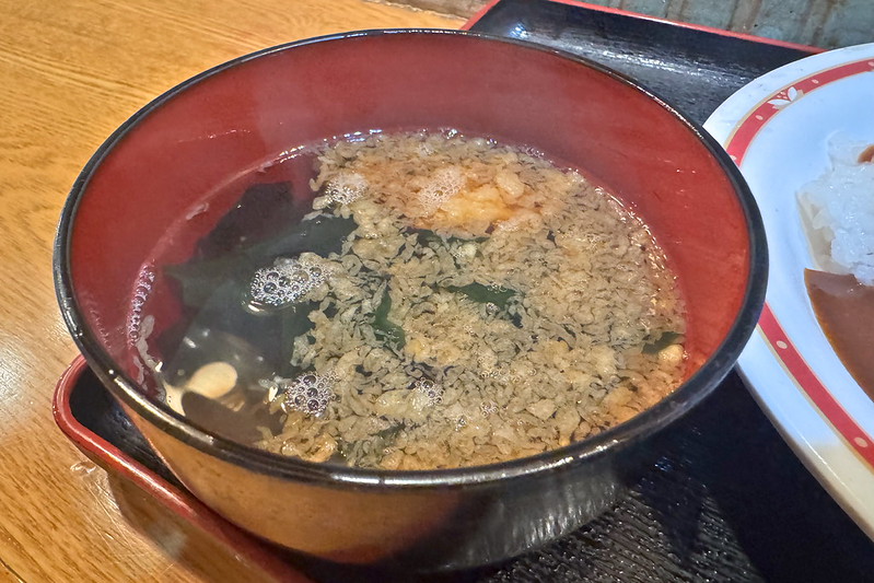 スープと言うか、これはうどんやそばの汁ですね。そこにワカメと天かすが入っています。濃厚でした。カレーもいいけど、この汁も美味しかったです。ちょっとうどんも欲しくなったけどさすがにお腹いっぱいになってしまいました。次回はこの汁でうどんを食べてみようと思います。