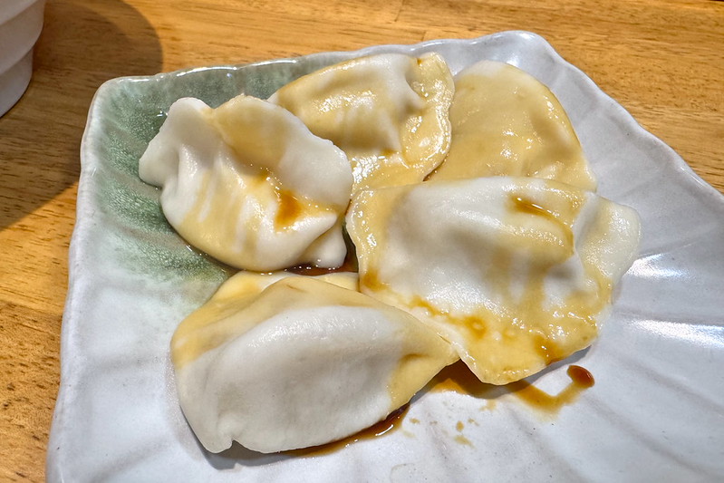 やや固めの茹で加減で歯ごたえがあり、具は少なくても食べごたえがあります。昔懐かしい感じです。このラーメンだけでもいいのですが、この日は水餃子も注文していました。