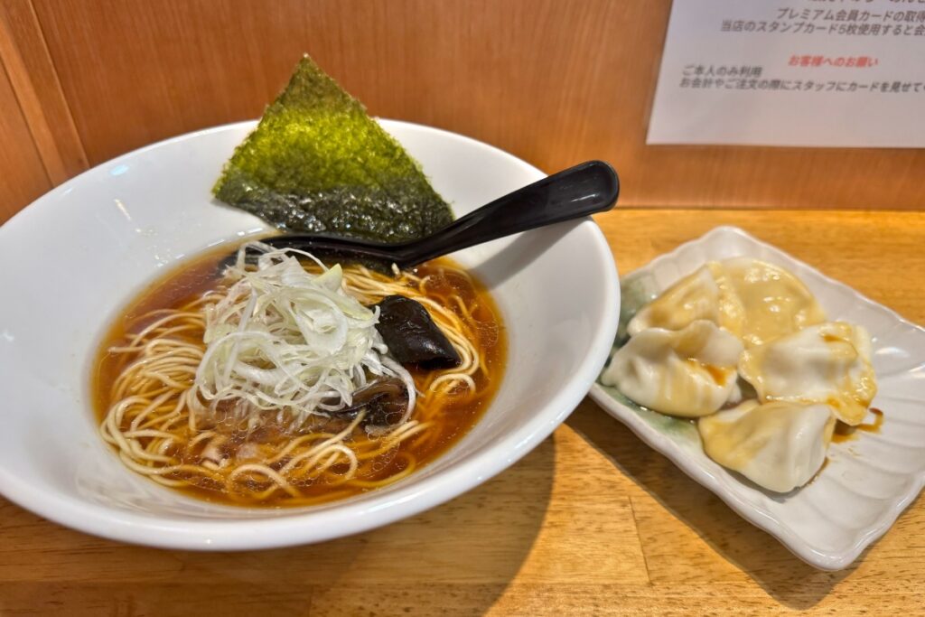 しばらくして出てきた醤油かけラーメンと水餃子がこちら。