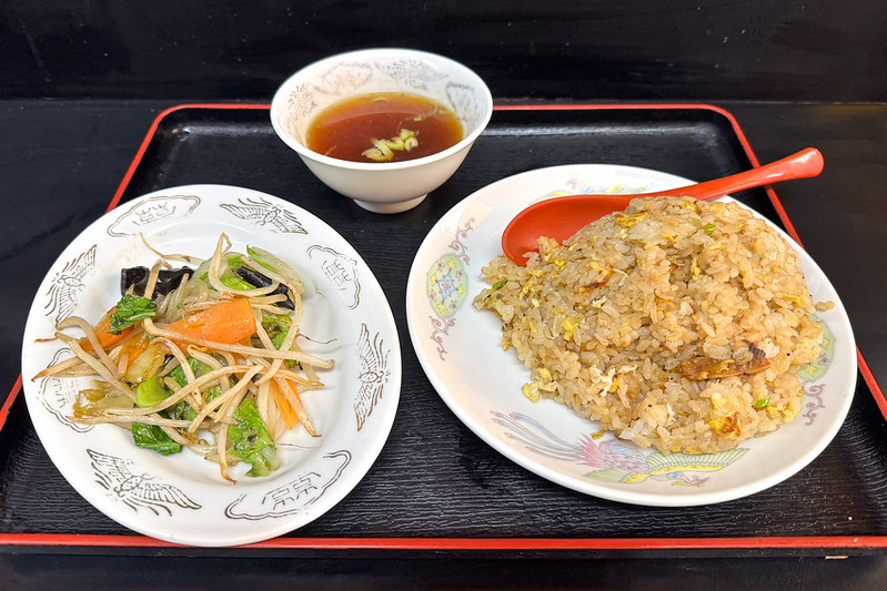 なんこつチャーハン、野菜炒め、スープの3点セットです。