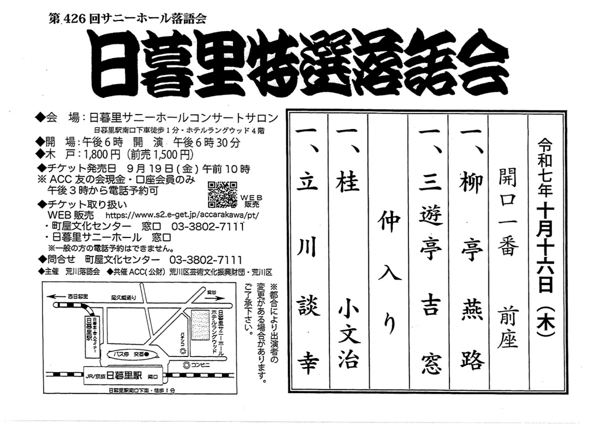 出演は荒川区観光大使でもある三遊亭好楽、三遊亭王楽、その他好楽一門です。しかも入場無料ですので、誰でも気軽に間近で落語を楽しむことができます。お近くの方はぜひ遊びに行ってみてください。